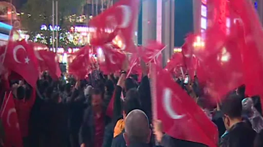 وفي الوقت ذاته، خرج انصار إردوغان حاملين الأعلام للاحتفال بنتيجة الاستفتاء، واثنى عليهم إردوغان ل "قرارهم التاريخي".
