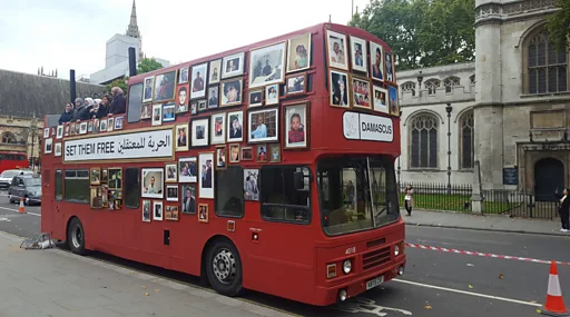 فمن الخارج، غطت صور معتقلين سوريين الحافلة، بينما كان داخلها ست سوريات أتين من سورية، ولبنان، وتركيا، وأنحاء أخرى من بريطانيا للتذكير بأقاربهن المختفيين منذ سنوات.