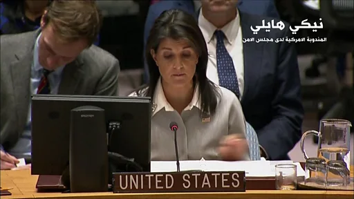 هاجمت السفيرة الأمريكية في الأمم المتحدة، نِكي هايلي، المنظمة الدولية وقالت إنها تقوض دعائم وفرص السلام بين الفلسطينيين وإسرائيل.