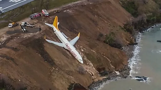 انتاب الهلع مسافرين في طائرة انحرفت عن مسار مدرج مطار تركي لتعلق عند حافة جرف صخري مطل على البحر وعلى بعد أمتار فقط من حافة المياه.