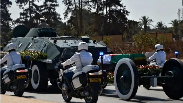 وشوهدت عربه عسكرية مزينة بالورود، تسبقها عربة تحمل الجنود، تجر الجثمان عبر شوارع العاصمة إلى مقبره العالية.