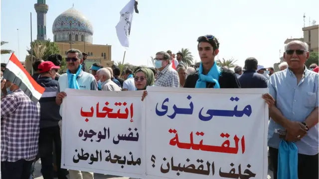 كما كُتب على اللافتات التي حملها متظاهرون بينهم نساء "متى سنرى القتلة خلف القضبان؟ ولا للأحزاب الفاسدة والساسة الفاسدين".