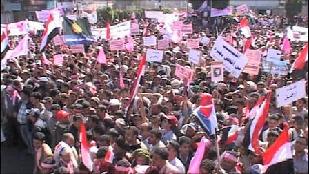 وقال مراسل بي بي سي إن المحتجين رفعوا شعارات تطالب بـ"وقف نهب الثروات الوطنية" في المسيرات التي قادها التكتل المشترك الذي يضم أكبر خمسة أحزاب معارضة يمنية وفي المقابل سير الحزب الحاكم مسيرة تؤيد السلطة وما ورد في خطاب الرئيس اليمني الأخير.