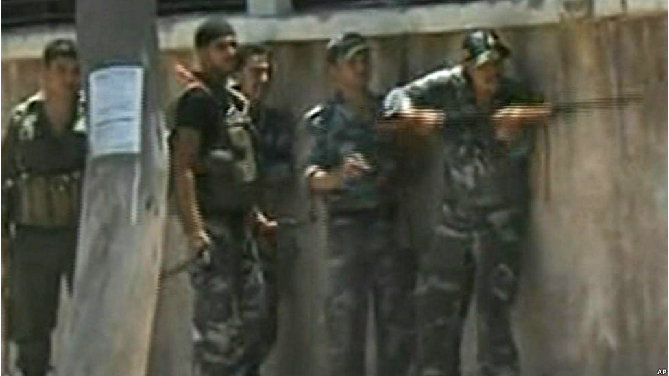 الصورة من شريط بثته شبكة شام نيوز لما تقول انه انتشار للقوات الامنية السورية لمقاتلة مسلحي المعارضة بدمشق في يوم 18/07/2012 . ولم يتم التحقق منه من جهة مستقلة.