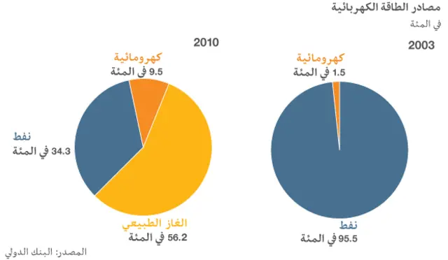 ورغم ان النفط يعتبر المصدر الرئيسي للدخل ويسهم بحصة الأسد في الناتج المحلي الاجمالي، ما زال العراق يفتقر الى القدرة على تصفية كميات منه تكفي للوفاء بحاجاته من الطاقة الكهربائية.