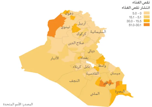شهد عدد الأشخاص الذين يكافحون من أجل الحصول على الغذاء في العراق انخفاضا في الأعوام الماضية. وبحسب برنامج الغذاء العالمي، انخفضت نسبة من يعانون من سوء التغذية بسبب عدم حصولهم على المواد الغذائية الأساسية لضمان حياة صحية إلى 5.7 في المئة عام 2011 بعد أن كانت سجلت نحو 7.5 في المئة عام 2007.