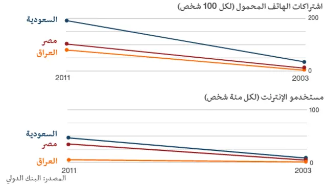 كما في سائر أرجاء العالم، انطلق استخدام الهواتف النقالة والانترنت بشكل كبير في العراق منذ عام 2003. ويملك 78 بالمئة من العراقيين هواتف نقالة الآن، ولكن عدد مستخدمي الانترنت لم يواكب الارتفاع الذي شهده استخدام الهواتف النقالة، إذ لا يستخدم الى خمسة بالمئة من العراقيين شبكة المعلومات العالمية.