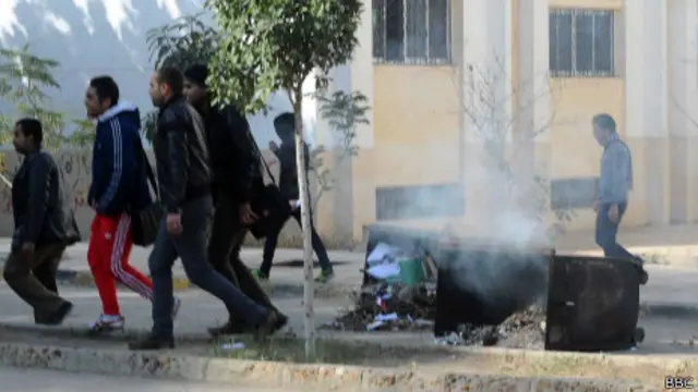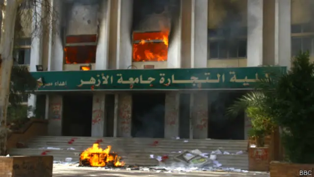 وقال مراسل بي بي سي من موقع الاشتباكات إن أعمدة الدخان الكثيف تصاعدت من بعض مباني الجامعة وهرعت سيارات الإطفاء لاطفاء حرائق التي اندلعت إثر الاشتباكات.