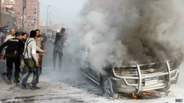 واضرم متظاهرون مؤيدون للرئيس المعزول محمد مرسي النار في عدة سيارات للشرطة في مناطق متفرقة بمحلفظتي القاهرة والجيزة.