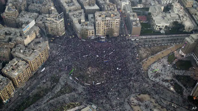 وتجمع آلاف من أنصار المؤسسة العسكرية والحكومة في ميدان التحرير، الذي يعد رمز الاحتجاجات الشعبية ضد مبارك في 2011.