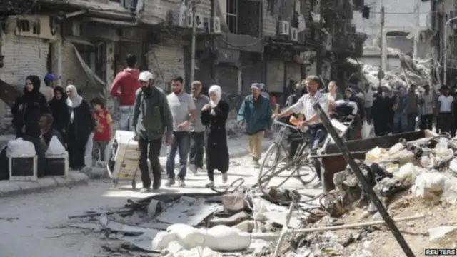 وقالت ليز دوسيت كبيرة المراسلين الدوليين لبي بي سي إن الغذاء والادوية شحيحان في مخيم اليرموك و إن مناطق كبيرة من المنطقة مدمرة تماما.