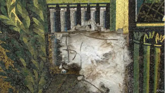 تصور هذه الفسيفساء رؤى للجنة وبها مبانٍ ساحرة تحيط بها الأشجار والحدائق، ورممت السلطات السورية هذه الأضرار منذ ذلك الحين.