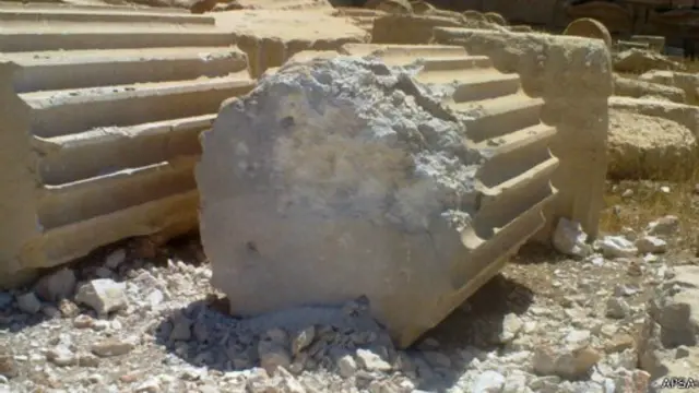 واستهدفت قذائف أعمدة معبد بل في المدينة القديمة (انظر إلى أعلى قبل تعرضها للقصف)، وهو ما تسبب في انهيار اثنين منها.