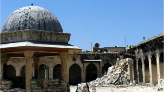 وانهارت المئذنة، التي بفضل طولها كانت بمثابة نقطة مراقبة للعدو وموقع للقناصة، بسبب تعرضها للقصف في مارس/آذار عام 2013. ويعادل تدميرها فقدان ساعة بيغ بن في سماء لندن.
