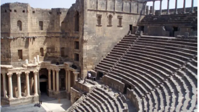 وإلى أقصى الجنوب، تختفي معالم مدرج بصرى، والتي كانت سابقا عاصمة الإقليم الروماني في الولاية العربية، داخل قلعة تعود للقرن الثالث عشر، ليس بعيدا عن الحدود الأردنية. واحتل خلال الحرب الحالية من جانب قناصة من الجيش السوري وعناصر الشبيحة ووضعت الحقائب الرملية على نوافذه والذين كانوا يطلقون النيران على جيوب قوات المعارضة في مدينة بصرى القديمة.
