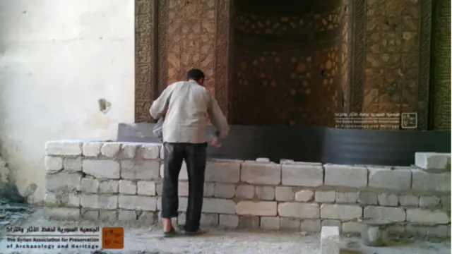 وهذا الجدار الواقي يجري بناؤه أمام مكان الصلاة في مدرسة الحلوية في حلب التي تعود للقرن الثالث عشر.