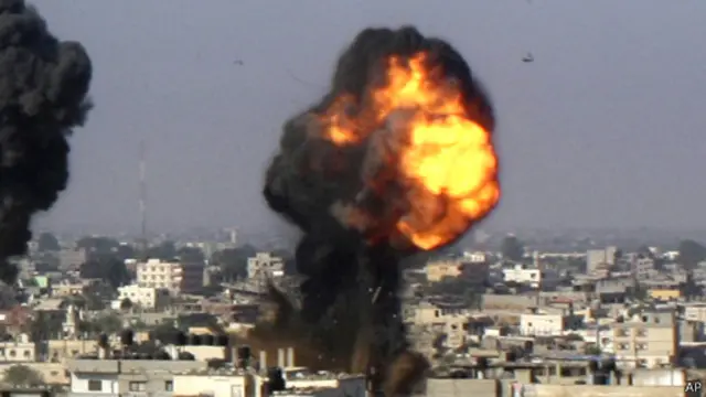 ونقلت وكالة الاسوشيتد برس صورا تظهر انهيار مبنى جراء انفجار ضخم في غزة مما اطلق سحب الدخان إلى عنان السماء ومعها حطام متطاير.