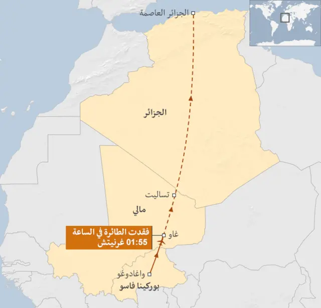 وقد أكد مسؤولون في هيئة ضبط الطيران المدني الجزائرية تحطم الطائرة الجزائرية في الصحراء بمالي.