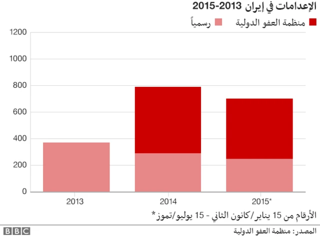 وكانت السلطات الإيرانية قد أعلنت رسميا أنه لغاية الـ 15 من تموز / يوليو 2015 تم تنفيذ 246 حكما قضائيا بالاعدام، ولكن منظمة العفو الدولية تقول إنها تسلمت تقارير تفيد باعدام 448 شخصا اضافيا.