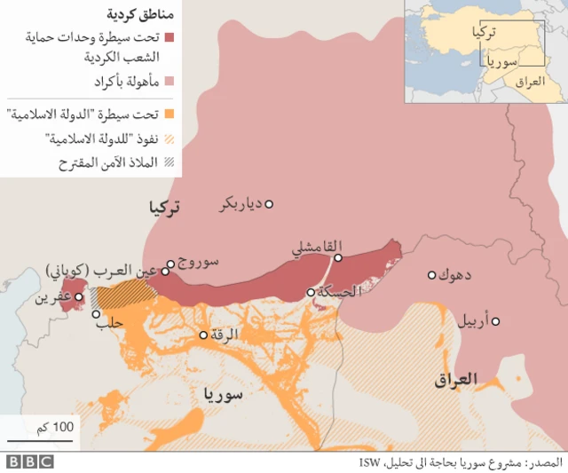 ويقول مراسل بي بي سي في تركيا، مارك لوين، إن هذه المنطقة التي، ستمتد لمسافة 90 كيلومترا، سوف تستخدم لتدريب المعارضة السورية المعتدلة.