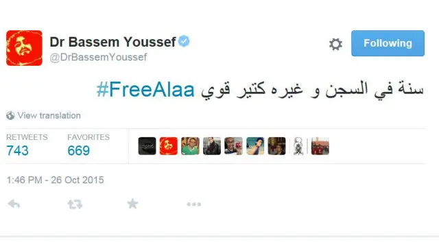 وبدل باسم يوسف صورته الشخصية على موقع تويتر ليضع بدلا منها صورة علاء عبدالفتاح، قائلا: "سنة في السجن وغيره كتير قوي #freealaa".