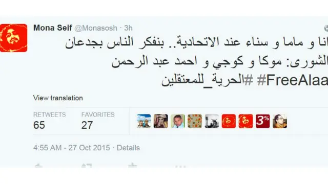 وكتبت الناشطة منى سيف، شقيقة علاء عبد الفتاح، تغريدة على موقع تويتر تذكر الناس - أثناء وقفتها وعائلتها أمام القصر الرئاسي- بعلاء وزملائه، مستخدمةهاشتاغين هما #FreeAlaa #الحرية_للمعتقلين. كما أعادت نشر أجزاء من منشور سابق علي فيسبوك حول القضية.