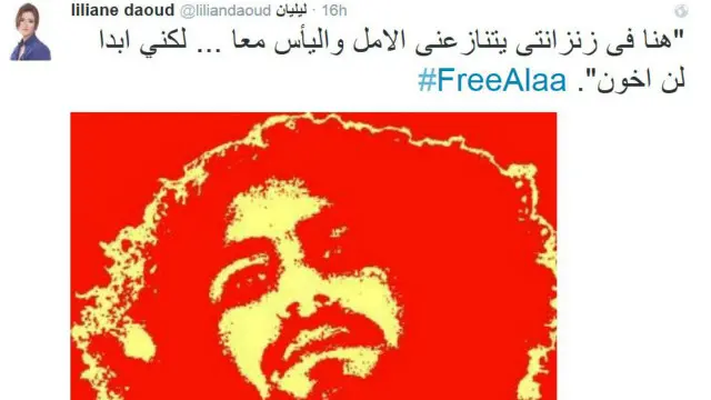 وكتبت ليليان داوود على حسابها على تويتر متضامنة مع علاء باستخدام إحدى تغريداته: "هنا فى زنزانتى يتنازعنى الأمل واليأس معا ... لكني أبدا لن أخون". #FreeAlaa