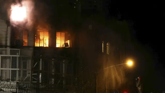كما تظهر إحدى الصور على موقع التواصل الاجتماعي تويتر، المحتجين خارج السفارة بينما تشتعل النيران في أحد أجزاء المبنى.