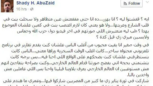 وكتب أبو زيد على حساب منسوب إليه على مواقع التواصل الاجتماعي رسالة نالت استحسان الآلاف بمجرد نشرها وعلق فيها نشر الفيديو وما وصفه بـ"تهديدات طالته وطالت عائلته".