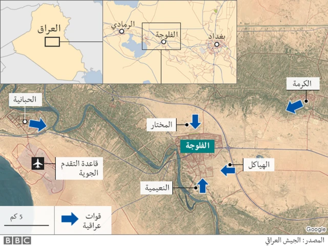 ويقول مراسل بي بي سي في بغداد جيم موير إن القوات الحكومية سيطرت على بلدتين في أطراف الفلوجة الجنوبية، لكنها لا تزال بعيدة عن أطراف المدينة على جبهات أخرى.