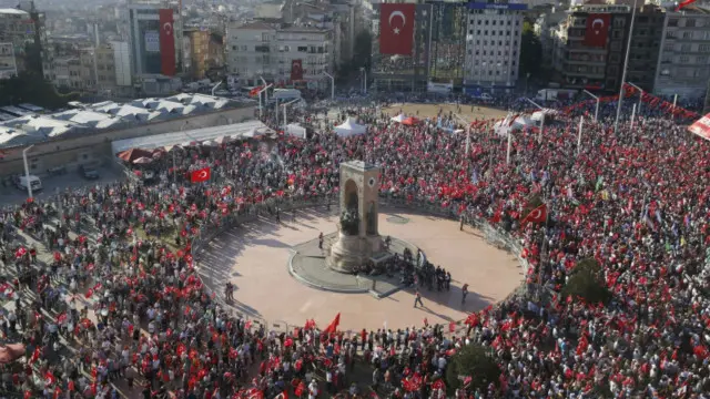 احتشد عشرات الآلاف من مناصري الحزبين الاكبرين في تركيا، حزب العدالة والتنمية وحزب الشعب الجمهوري المعارض، بالاضافة إلى احزاب اخرى في ساحة تقسيم باسطنبول للاحتجاج على محاولة الإنقلاب الفاشلة في البلاد الأسبوع الماضي، وتزامن ذلك مع إعلان السلطات التركية عن عزمها حل الحرس الرئاسي بعد اعتقال قرابة 300 من أفراده بتهمة المشاركة في تلك المحاولة.