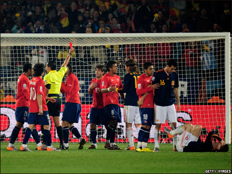 25/6: حكم المباراة المكسيكي يطرد لاعب تشيلي ماركو استرادا لخطأ ارتكبه بحق اللاعب الاسباني فرناندو توريس