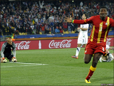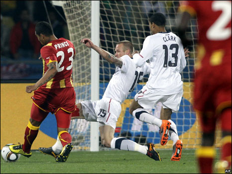 26/6: كيفن برنس بواتينغ يسجل هدف غانا الاول في المرمى الامريكي في الدقيقة الخامسة من المباراة