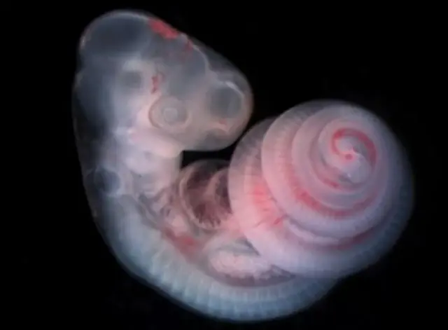صورة لتيلور سكوير داخل بيضة ثعبان منزلي أفريقي عمر يوم. وقال سكوير :"خلال مراحل النمو الأولى، تكون معظم الحيوانات الفقارية متشابهة. وهنا الجسم الذي يمتد طوله إلى 5 ميلليمترات وهو ملفوف بشكل حلزوني كي يتلائم مع البيضة."