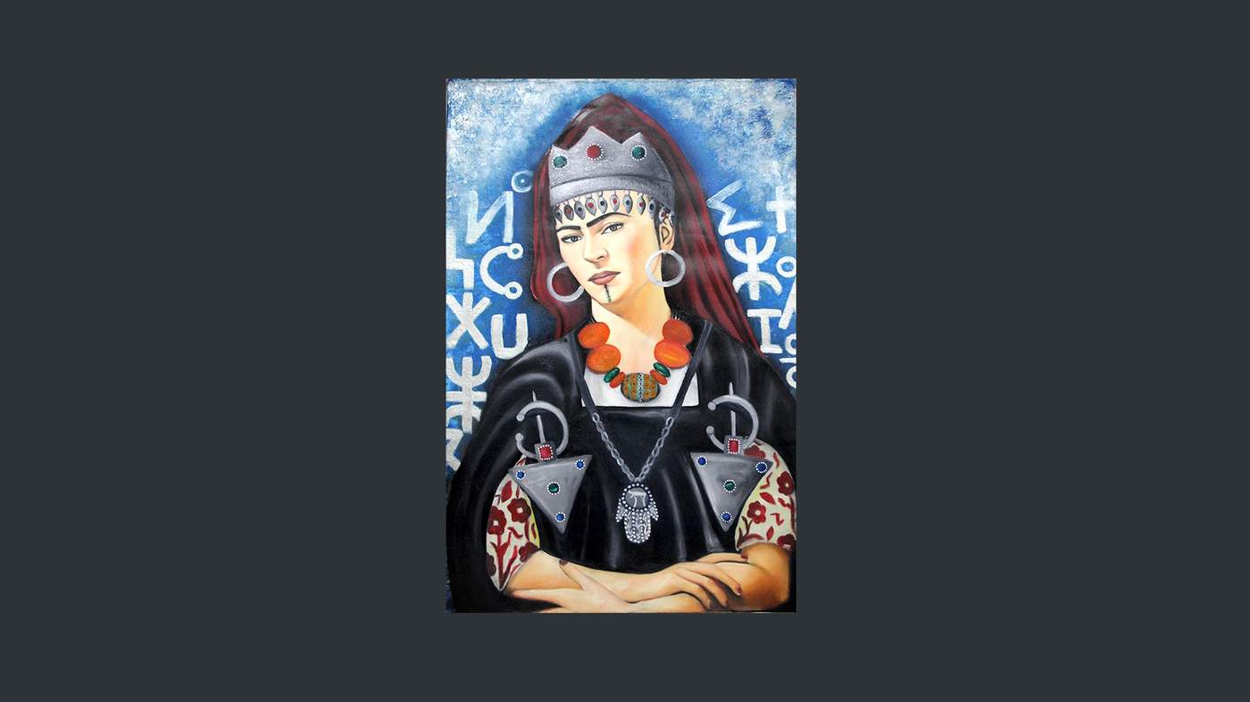 وفي لوحتي التي أسميتها "فريدة بنت تزنيت" رسمتك فيها بنظرة تجمع الجمال والاعتزاز والتحدي وأبدلت حلتكِ "التيخوانا" المكسيكية التقليدية بحلة أمازيغية من مدينة تزنيت في جنوب المغرب وأبدلت حليتك المستوحاة من الحضارات اللاتينية بحلية تزرزيرت وقلادات الخمسة والمرجان. كما زينت وجهك بنقوشنا الأزلية التي تحاور حروف لغة التيفيناغ التي نشرتها خلفك. ومع بعد المسافة بين الجغرافيتين فقد رأيت تقارب كل حضاراتنا القديمة في العادات والرموز والألوان وكنت على يقين أنك تقفين معي لأنتصر لحضارة أخرى مهمشة كان ولا يزال لا بد من رد اعتبارها.