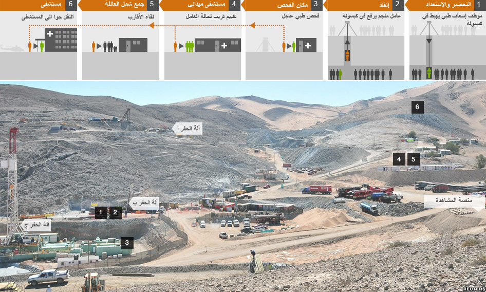 وفي حالة الطوارئ ينقل العمال جوا إلى أقرب مستشفى في كوبيابو. علما ان هناك ثلاث طائرات هليكوبتر بالانتظار في منطقة المنجم.