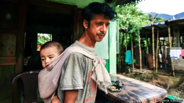 يعبر رجل من السكان المحليين جسراً من سلك الفولاذ الحديث في طريقه إلى بلدة نانجريات قادما من قرية تيرنا حيث ينتهي الطريق وتبدأ رحلة الخمسة كيلومترات سيراً إلى تلك البلدة.