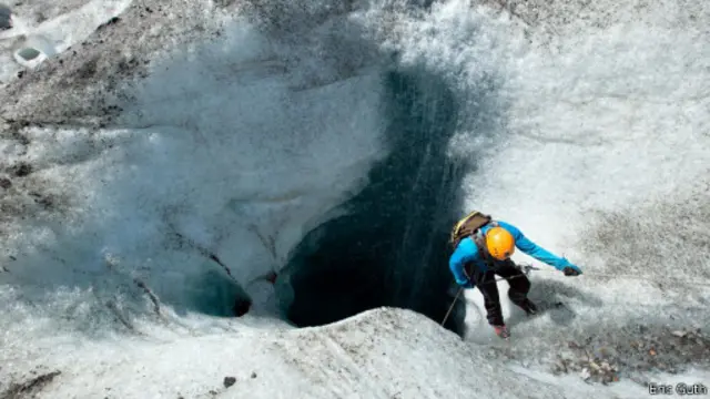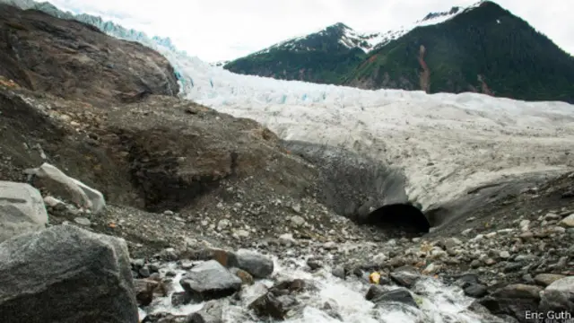 فمن على الجانب الغربي لـ"نهر مندنهال الجليدي"، كان بمقدوري رؤية شريط منساب من المياه الناتجة عن ذوبان الثلوج، وقد أحدثت حفرة في جانب النهر الجليدي، لينجم عن ذلك فراغ جلي ورائع. وهكذا تتدفق السيول الناجمة عن ذوبان الثلوج خلال الصيف لتتلاشى بداخل ظلام ذلك الثقب، بما يروي ظمأ هذا العملاق الجليدي.