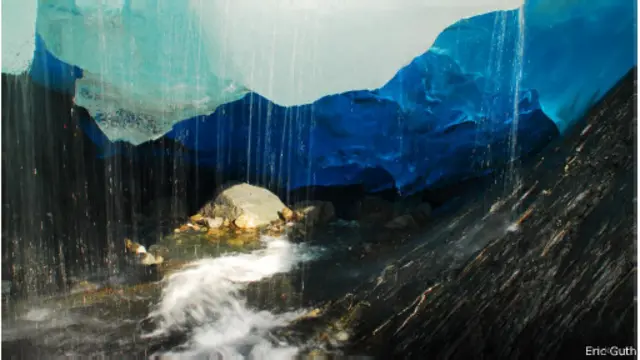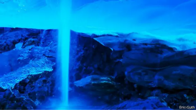 ويكشف تتبع المرء لمسار هذه المياه إلى داخل الجليد عن عالم غير متوقع على الإطلاق؛ يعج بدرجات ذات طابع سريالي وغريب من اللون الأزرق.