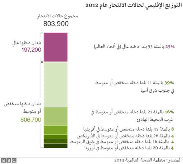 ولكن التوزيع يتفاوت بشدة بين الدول ذات الدخل العالي والدول ذات الدخل المحدود والمتوسط. في الواقع، تحدث 75 في المئة من حوادث الانتحار في العالم في الفئة الأخيرة.