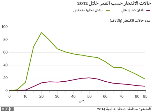 ولكن هذا الارتفاع لا يرى في المجتمعات الأكثر ثراء، وهو ما قد يعني أن هذه الفئة العمرية أكثر عرضة للانتحار في المجتمعات الفقيرة.