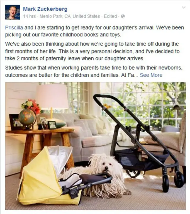 وتسمح الشركة التي تدير فيسبوك لموظفيها في الولايات المتحدة بالتمتع بإجازة أبوة لمدة أربعة أشهر، وهي إجازة يمكن التمتع بها حال ولادة الطفل أو خلال السنة الأولى من عمره.