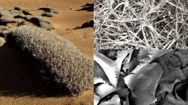 ونبات تيلاندسيا من النباتات الشوكية رمادي اللون بلا جذور، ويتشبث بضعف في الكثبان الرملية، لكنه يتكيف على نطاق المكان النابت به ليحقق أعلى استفادة ممكنة من الضباب.