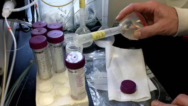 في غرفة الفحص الرئيسية، توجد أجهزة قياس وحاويات صغيرة في كل مكان. بعضها مخزن في علب تشبه علب البيتزا بغرض ترتيبها بصورة جيدة. إحدى الماكينات تعمل على تبخير العينات عند درجة حرارة تصل إلى 10000 كيلفين (أي حوالي 9700 درجة مئوية).