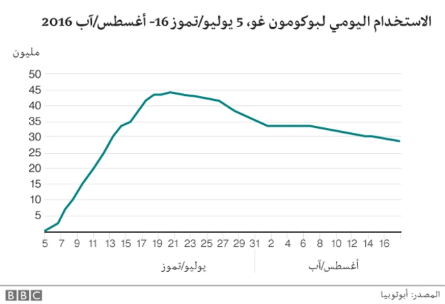 كما أشارت مؤشرات الاستخدام اليومية إلى أنها قفزت لتسجيل نحو 45 مليون مستخدم في 17 يوليو/تموز، لكن بحلول 16 أغسطس/آب تراجعت الأرقام لتصل إلى أكثر من 30 مليون مستخدم.