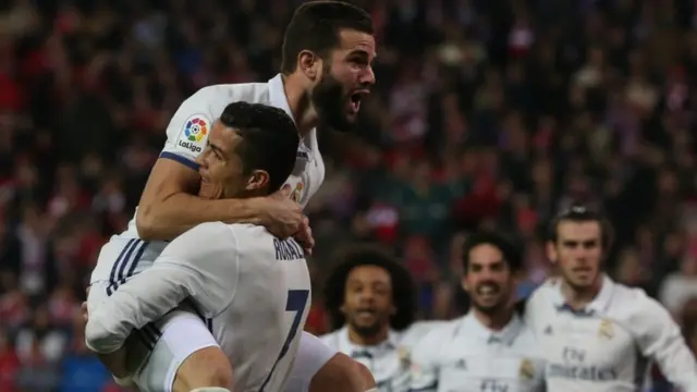 سجل كريستيانو رونالدو ثلاثة أهداف ليقود فريقه ريال مدريد للفوز على أتليتيكو بالدوري الأسباني.