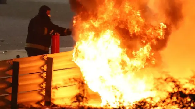 وعلقت سيارة هاس المحترقة في الحاجز، مع مرور ما يقرب من 30 ثانية، قبل أن يتسلق غروجان الحاجز، بينما هرعت الطواقم الطبية للمساعدة.