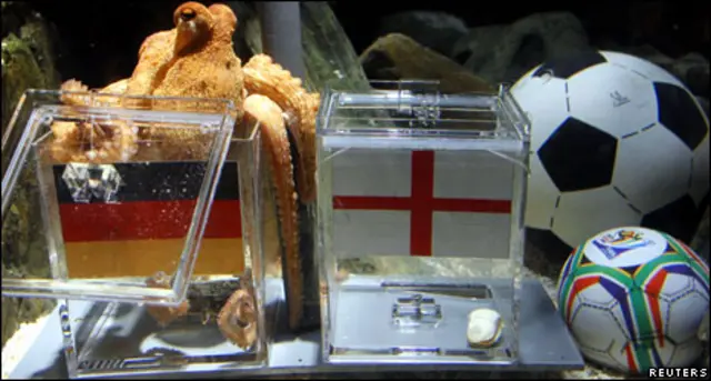توقع اخطبوط في حديقة مائية بالمانيا يقال إن له ملكة التنجيم بفوز المنتخب الالماني على نظيره الانجليزي في المباراة التي ستجمع بين المنتخبين في دور الـ 16 لبطولة كأس العالم لكرة القدم يوم الاحد المقبل.