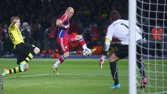 سجل الهولندي ارين روبن ولاعب المنتخب الالماني توماس مولر هدفين في الوقت الإضافي ليقودا بايرن ميونيخ للفوز بعد انتهاء الوقت الاصلي بالتعادل السلبي.