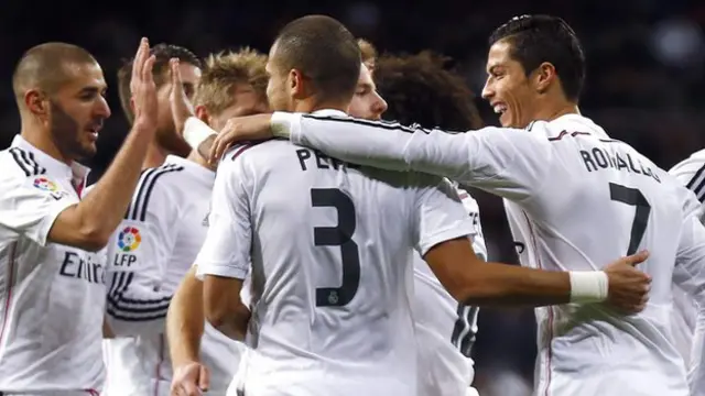 وجاء هدف رونالدو الاول في المباراة التي جرت في ملعب برنابيو بمدريد عن طريق ضربة جزاء مختلف عليها.